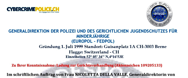 Weit origineller die Post von „Frau Nicoletta della Valle, Direktorin von FEDPOL Jugendschutz“ in der Schweiz. Unnötig zu betonen, daß es ziemlich grotesk wäre, mir etwas im Zusammenhang mit Pädophilie vorzuwerfen. Aber es gibt die genannte Juristin tatsächlich. Es gibt auch die FEDPOL und deren Abteilung „Pädokriminalität“. Es gibt ferner die Schweizer Cybercrimepolice, bei der sich die Absender jener Post an mich gleich selbst anzeigen könnten.