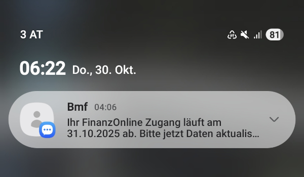 Mehr noch, wieso sollte mein FinanzOnline-Zugang „ablaufen“? Möchte mich beim Finanzamt jemand loswerden? Sicher nicht! Da wollte jemand an meine Daten kommen. Und weshalb via SMS? Eventuell, weil ich meine Telefonnummer vorher eben erst rausgerückt hatte. Und zwar vermeintlich an einen Facebook-Kontakt.