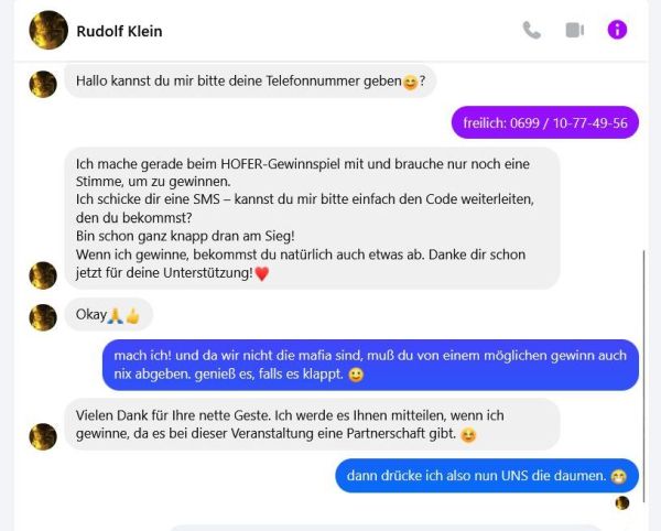 Es erstaunte mich zwar, daß Rudi Klein bei einem Supermarkt-Gewinnspiel mitmacht, aber das ist ja nicht anrüchig. Wir hatten dazu eine kurze Korrespondenz, bei der „er“ dann allerdings mit mir plötzlich per Sie war. Da dämmerte mir: Das ist nicht der Rudi, obwohl es klar über seinen Messenger kam.