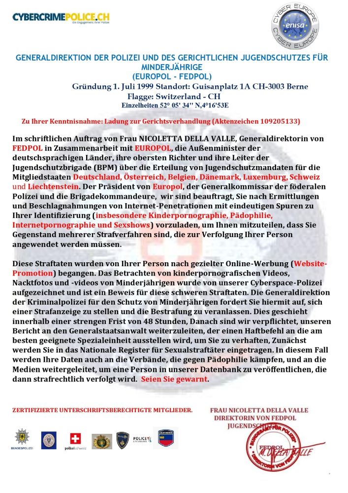 Weit origineller die Post von „Frau Nicoletta della Valle, Direktorin von FEDPOL Jugendschutz“ in der Schweiz. Unnötig zu betonen, daß es ziemlich grotesk wäre, mir etwas im Zusammenhang mit Pädophilie vorzuwerfen. Aber es gibt die genannte Juristin tatsächlich. Es gibt auch die FEDPOL und deren Abteilung „Pädokriminalität“. Es gibt ferner die Schweizer Cybercrimepolice, bei der sich die Absender jener Post an mich gleich selbst anzeigen könnten.