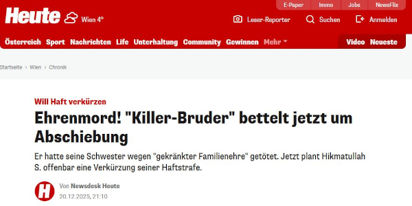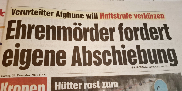 Ein aktuelles Beispiel. Am Sonntag, dem 21. Dezember 2025, hat ein erregter Headliner die Eins der Kronenzeitung so aufgemacht: „Ehrenmörder fordert eigene Abschiebung“. Zur Erläuterung: „Verurteilter Afghane will Haftstrafe verkürzen“. Finden Sie den Fehler!