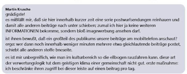 Ich habe gute Gründe, diese Leiste mit einer Anfrage-Option zu sichern. Das heißt, bevor jemand dort was raufladen kann, muß ich das genehmigen, den Zugang öffnen. Weshalb? Ich habe schon etliche Leute vom Platz verwiesen, weil sie dieses Feuilleton und dessen Publikum einfach bloß benutzen, um gelegentlich eine Postwurfsendung reinzuhauen. Eine Zumutung!