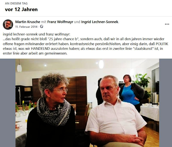 Amüsantes Detail: Die Erinnerungsmaschine von Facebook hat mit heute einen Text vom 11. Februar 2014 aus dem Stapel gezogen, der zum Thema paßt: „ingrid lechner-sonnek und franz wolfmayr… das heißt grade nicht bloß ‚25 jahre chance b‘, sondern auch, daß wir in all den jahren immer wieder offene fragen miteinander erörtert haben. kontrastsreiche persönlichleiten, aber einig darin, daß POLITIK etwas ist, was wir HANDELND auszuloten haben; als etwas das erst in zweiter linie ‚staatskunst‘ ist, in erster linie aber arbeit am gemeinwesen.“